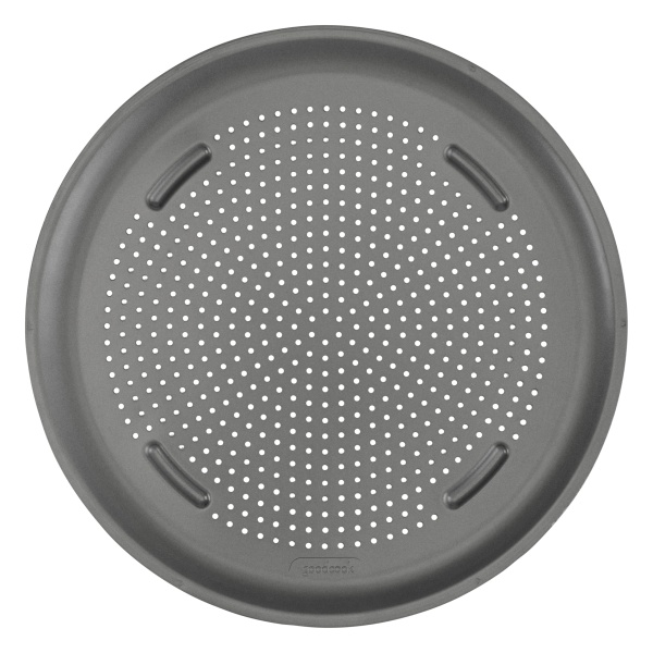 Details: Bring premium bakeware to your home kitchen with the GoodCook 16″ Pizza Pan. This nonstick pizza pan ensures even heating and is perforated to reduce moisture for a perfectly crispy crust when making homemade pizza. Designed for anyone, it is also great for baking frozen pizzas and reheating leftover slices. The convenient cutting guides make it easy to serve perfectly even slices, while the feet on the bottom keep the hot pan elevated and off the countertop. The nonstick coating provides excellent release and makes cleanup quick and easy. This large pizza pan measures 15.75″ in diameter and is made of nonstick carbon steel for premium-grade construction that resists warping to offer delicious baking for years to come.